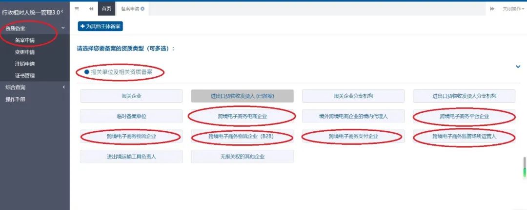 步骤二:在“资质备案”-“备案申请”项下,选择“报关单位及相关资质备案”条目,在列表中,选择跨境电商类型: