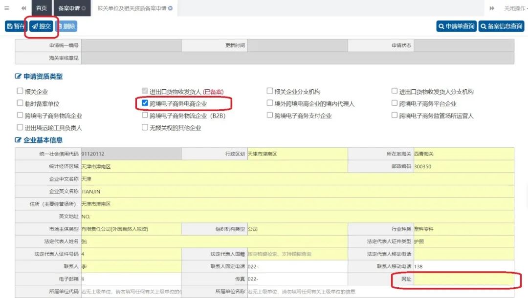 步骤四:在新页面,选中备案的跨境电商类型,并准确的填写网址后,点击提交即可。