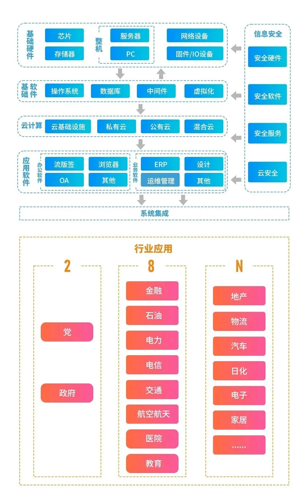 什么是信创?信创,即信息技术应用创新产业,始于2016年,兴起于2020年,如今信创热潮正在席卷整个IC产业。“十四五”引领信创产业大踏步前进。目前我国信创产业已基本构建了从上游基础技术到下游行业应用的全产业链条。