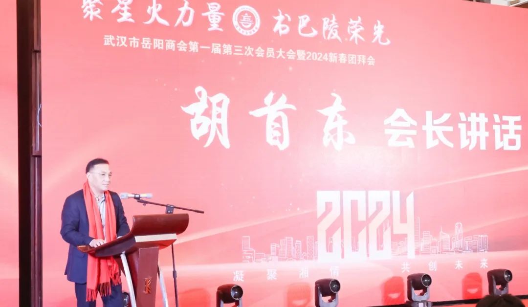 会长胡首东致大会欢迎词,他表示,2023年是商会践行“团结、合作、发展、共赢”的办会宗旨、脚踏实地打下长远基础的重要一年。这一年,商会高举旗帜,加强党建引领;这一年,商会用心服务,扩大队伍建设,奋楫笃行,坚持规范发展,以倾听企业心声为目标,走进多家企业召开会长办公会和理事会;这一年,商会尽职尽责,履行建设家乡、回报家乡的使命,协助家乡政府在汉开展招商引才推介会。他强调今后将全力以赴挑起会长的担子,尽职尽责不辱使命,同心同力与各位会员们一起开拓进取、团结一致,发挥商会的资源优势创建各类经营平台,努力将商会打造成有特色、有影响力、有持续发展潜力的商会。