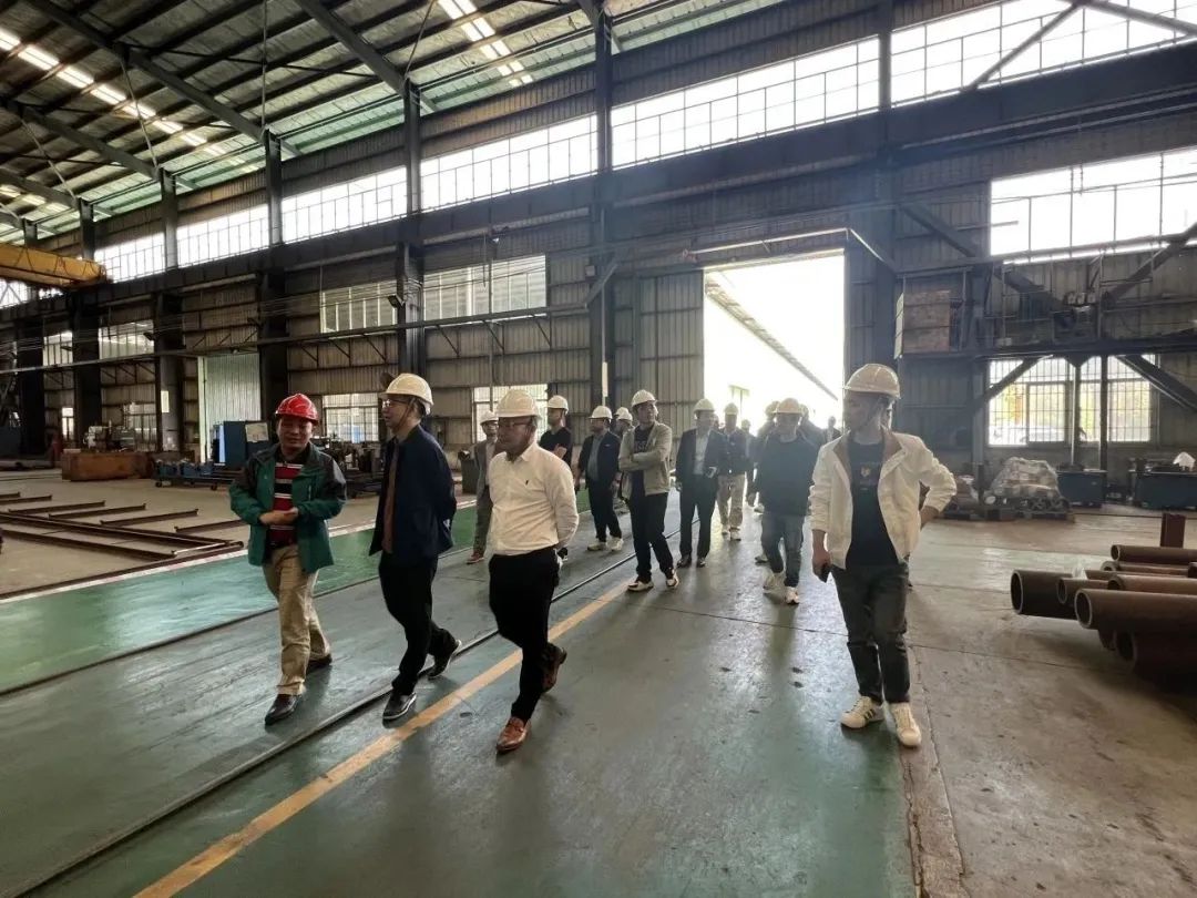 商会一行首先前往广东博盈特焊技术股份有限公司参观学习,董事长李海生介绍了博盈特焊的公司概况和产品技术,并带领大家参观了生产车间。在车间,大家交流了高温、高酸、高湿度环境下的焊接材料特性、发光材料钨丝的切割技术,合金材料的熔合技术等等,与相关负责人热烈交流,寻求合作机会。
