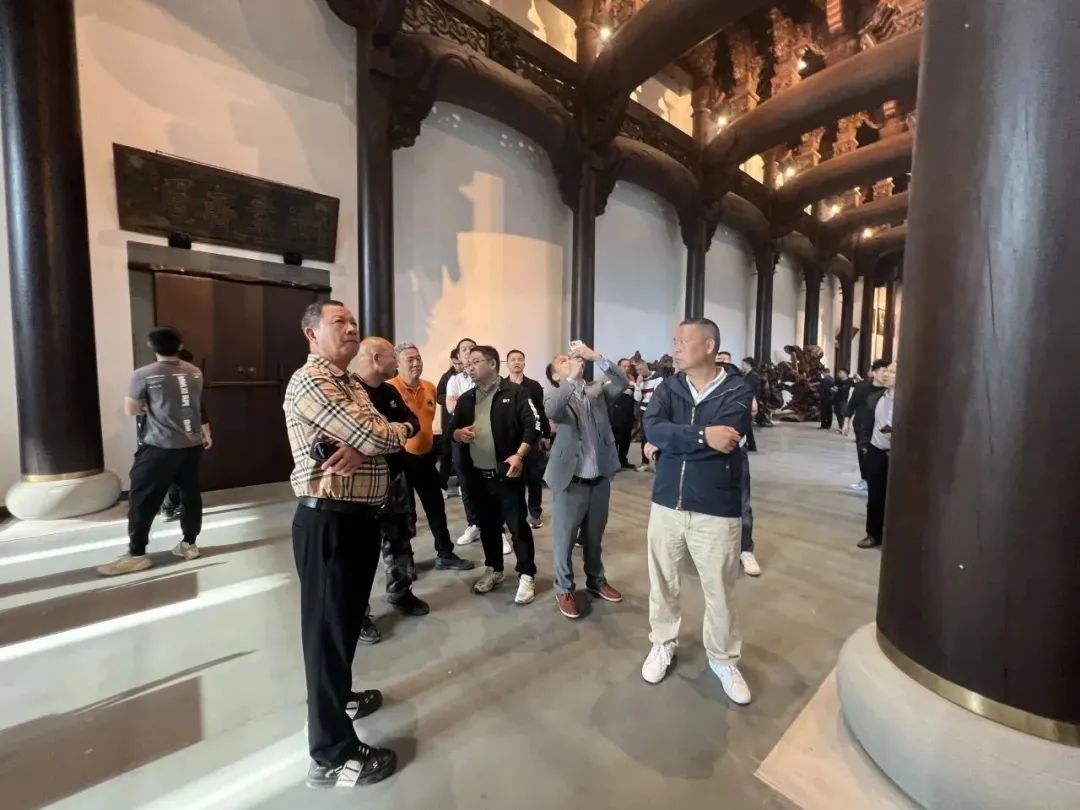 随后,一行人前往来苏山水人家项目参观,广东鸿业家具制造有限公司董事长王洪杰热情招待众人前往参观木雕陈列室,并逐一介绍木雕摆件的艺术特色。