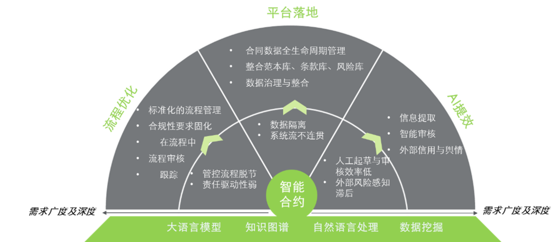 大语言模型开创了文本类智能化技术与服务的新局面。合同智能管理高度依赖于自然语言处理技术和法律领域的深度知识,将合同文本转化为结构化数据,从而实现对合同内容的智能化分析和管理。大语言模型技术在自然语言处理方面表现突出,它通过对合同文本进行智能标注、起草、审阅和履约监控等多种功能,提升合同管理的效率和准确性。