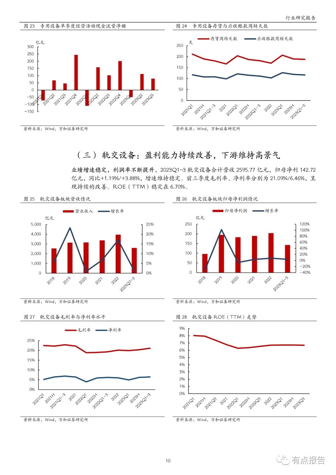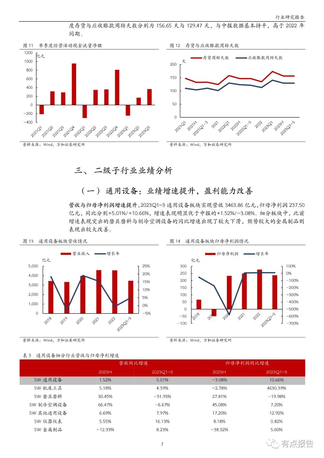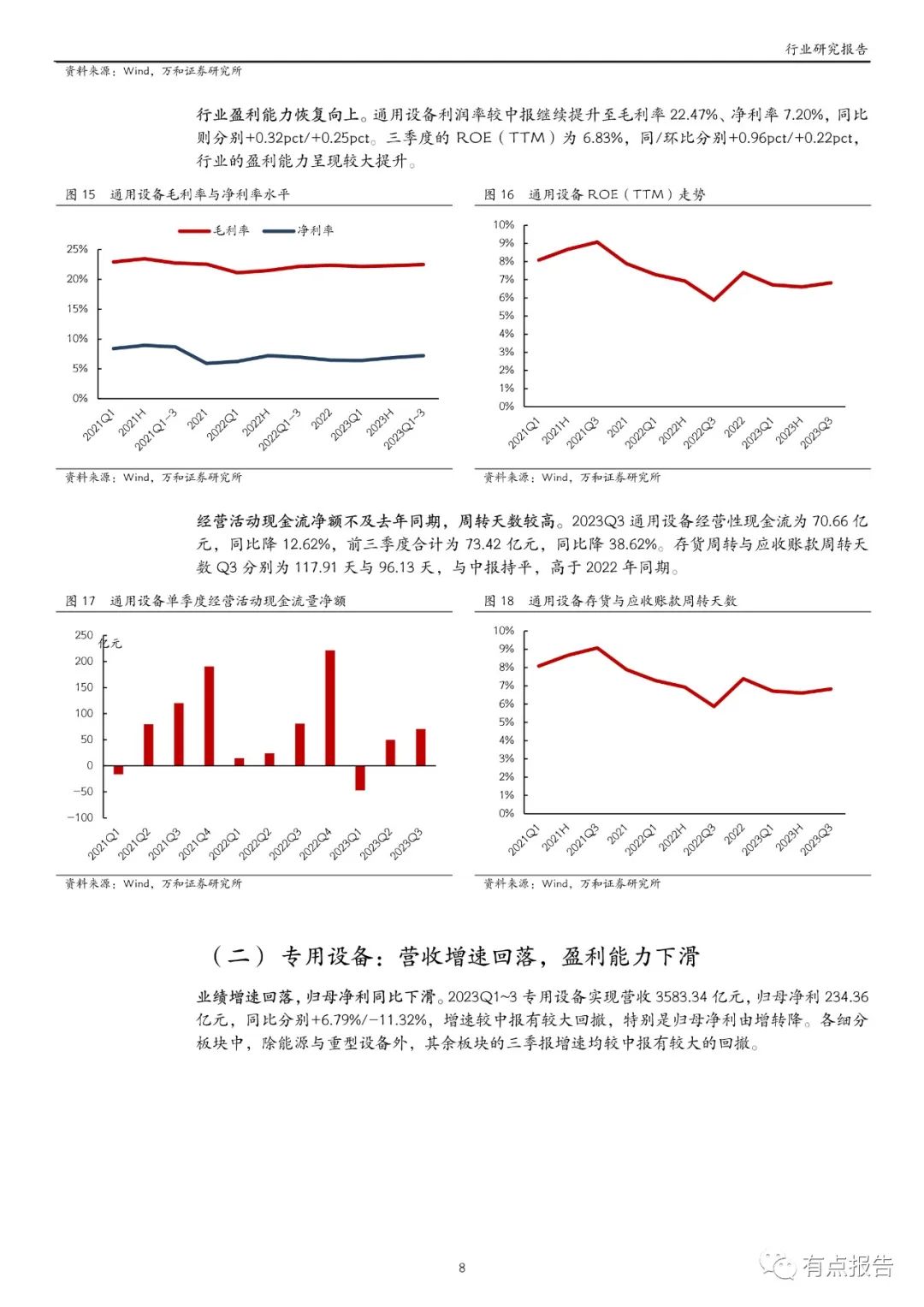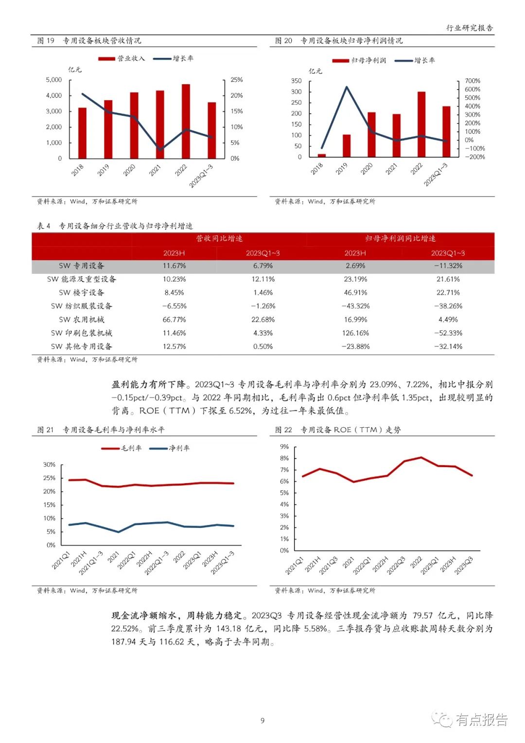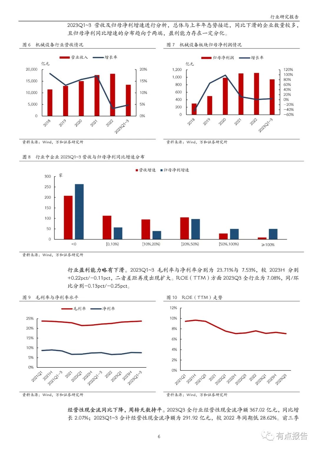 行业业绩增速放缓,维持稳健增长。2023 前三季度机械设备行业共实现营收 1.35万亿元,同比增长 4.77%,实现归母净利 944.23 亿元,同比增长 4.44%,增速相较于 2023H 均有所下降。行业内企业 2023Q1~3 营收及归母净利增速总体与上半年态势接近,同比下滑的企业数量较多。