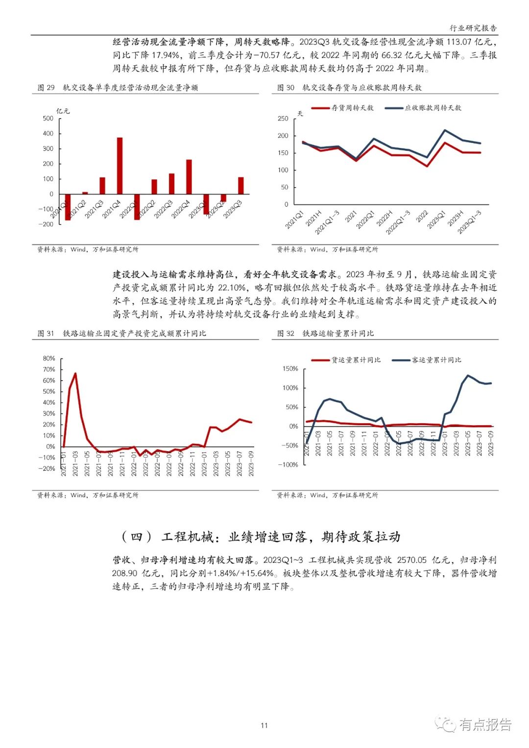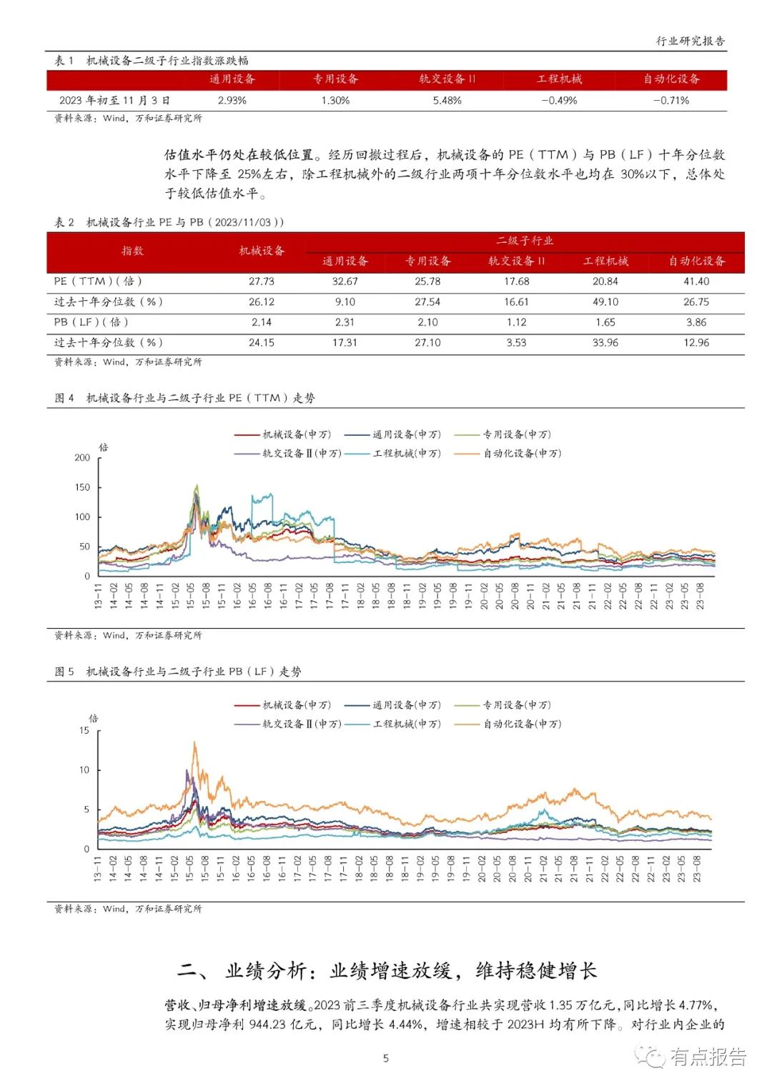 行业指数涨幅回撤。2023 年初至 11 月 3 日,SW 机械设备行业指数上涨 1.40%,在申万一级行业中排名第 9,跑赢沪深 300 指数 8.83 个百分点。子行业中轨交设备涨幅居首,达 5.48%,其次为通用设备与专用设备,工程机械与自动化设备下跌。
