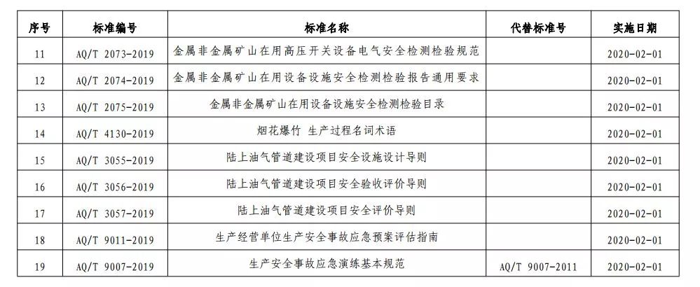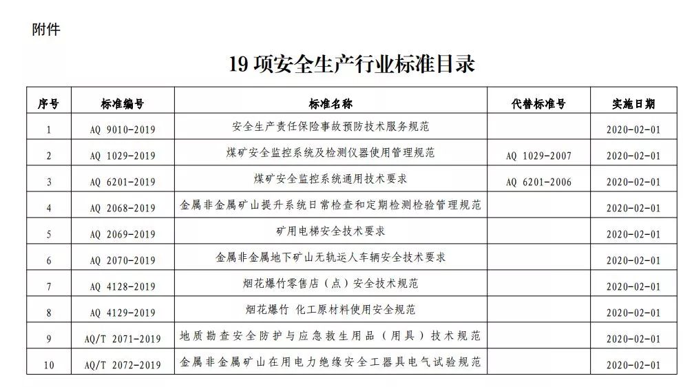 中华人民共和国应急管理部批准以下19项安全生产行业标准(目录见附件),自2020年2月1日起施行,现予以公布。
