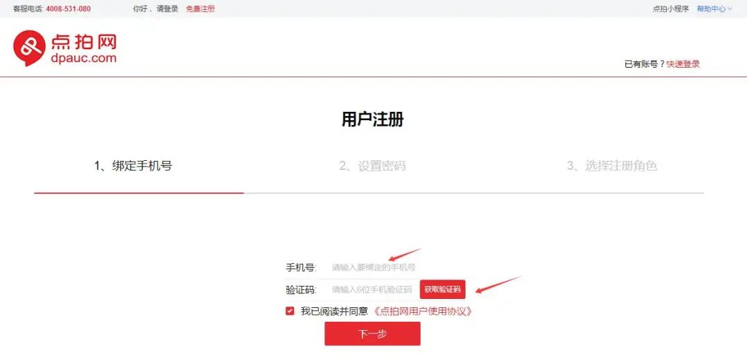 (二)电脑端操作:百度搜索“点拍网”或者浏览器直接输入点拍网(www.dpauc.com)网址,进入网址,点击右上方“免费注册”,根据提示填写资料,完成后点击提交即可。具体操作流程参照点拍网首页右侧“帮助中心”。