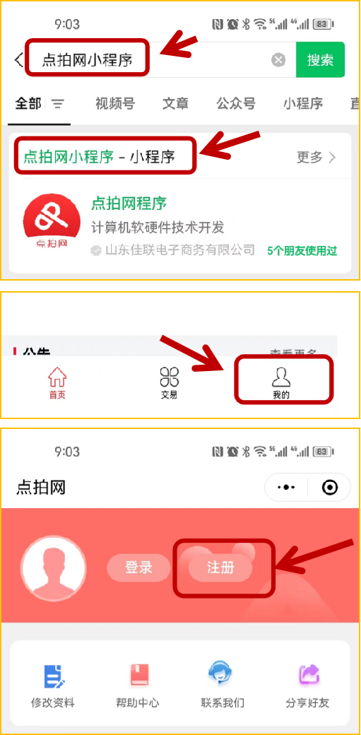 (一)手机端操作: 打开“微信小程序”搜索“点拍网程序“进入小程序----点击右下角“我的”----再点击“注册”,然后根据提示填写资料,之后提交,即可完成注册。