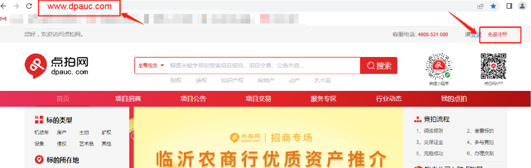 登录点拍网(www.dpauc.com),注册竞买人,完善相关信息后提交(注册竞买人流程请参考第五条或者联系拍卖公司工作人员协助),平台即时通过后需交保证金并告知拍卖公司注册帐号,由工作人员关联权限;已注册的,交保证金后联系拍卖公司工作人员关联权限,关联权限后即可参与拍卖。