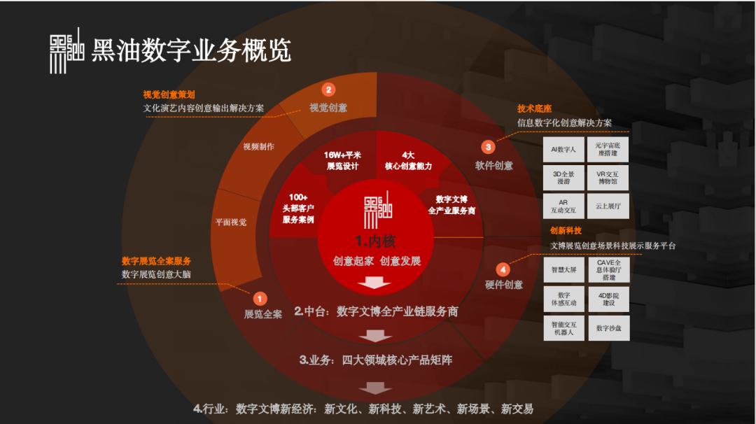 北京黑油数字展览股份有限公司是一家集品牌规划、展览展示设计制作、影视策划制作发行、品牌推广宣传于一体的综合性文化品牌建设全产业链企业。