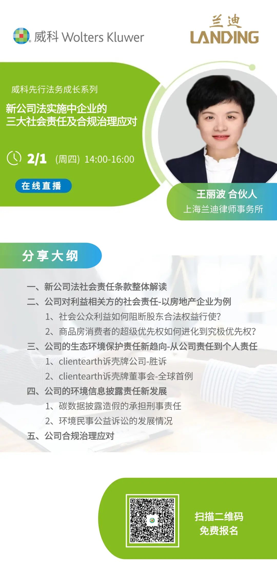 鉴于此,威科先行特邀上海兰迪律师事务所王丽波律师,围绕本次新公司法的社会责任条款所涉及的三大公司社会责任,即利益相关方保护、生态环境保护、社会责任报告发布(即ESG信息披露),结合中外ESG发展最新实践,以案说法,具体生动的分析公司及管理层在公司法实施后所应承担社会责任以及公司的合规治理策略。