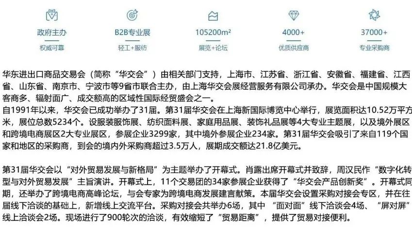 置身于改革开放的宏大背景中,30年来,华交会坚持立足华东、辐射全国、面向世界的办展目标,坚持专业化和精细化的办展方向,坚持进出口贸易并举的办展方式;大力扶持创新、引进外贸新业态,倾力服务长三角一体化发展和我国外贸发展大局。华交会已经成为我国规模最大、客商最多、辐射面最广、成交额最高的区域性国际经贸盛会之一,也是国际市场的晴雨表和我国进出口走势的风向标。