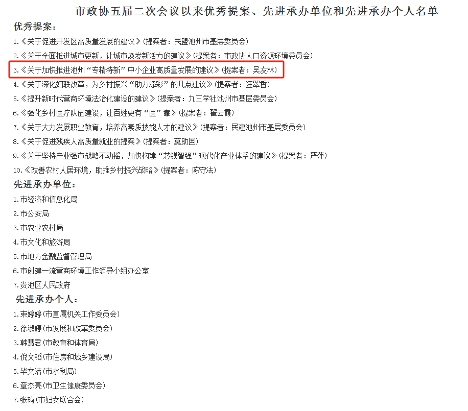 为树立典型、表彰先进,激发市政协委员、市政协各参加单位和各专门委员会的履职动力,促进提案办理单位进一步提高办理实效,近日,政协池州市委员会发布了《关于表彰市政协五届二次会议以来优秀提案、先进承办单位和先进承办个人的决定》,其中池州青年徽商商会副会长吴友林《关于加快推进池州“专精特新”中小企业高质量发展的建议》获评市政协五届二次会议以来优秀提案并接受表彰。