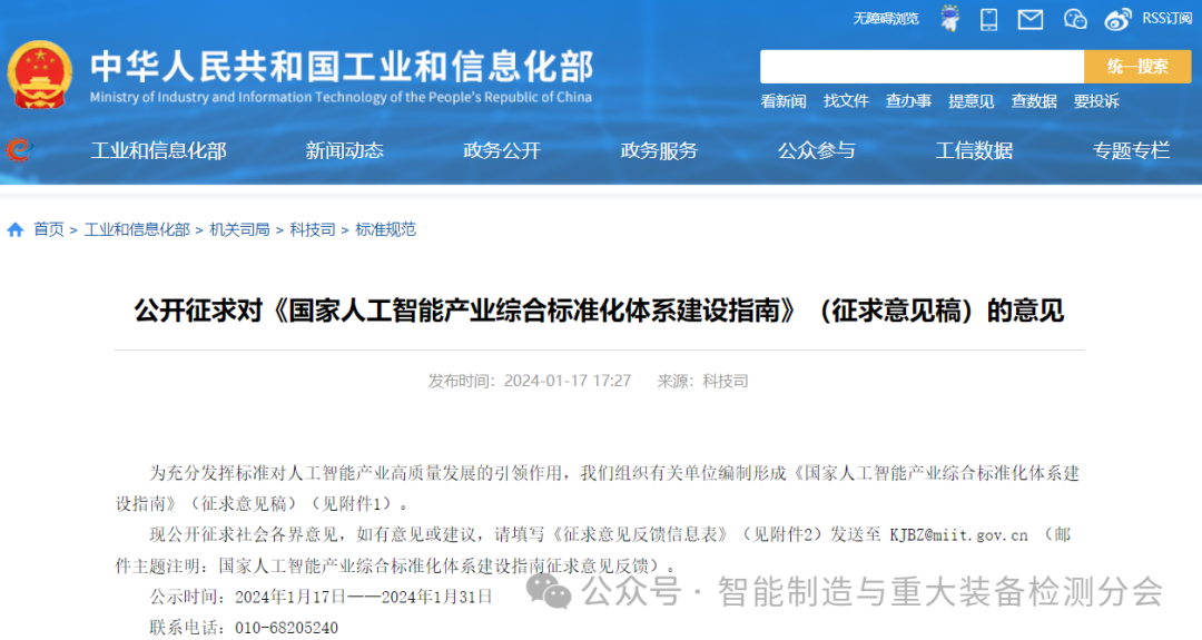 现公开征求社会各界意见,如有意见或建议,请填写《征求意见反馈信息表》(见附件2)发送至 KJBZ@miit.gov.cn (邮件主题注明:国家人工智能产业综合标准化体系建设指南征求意见反馈)。