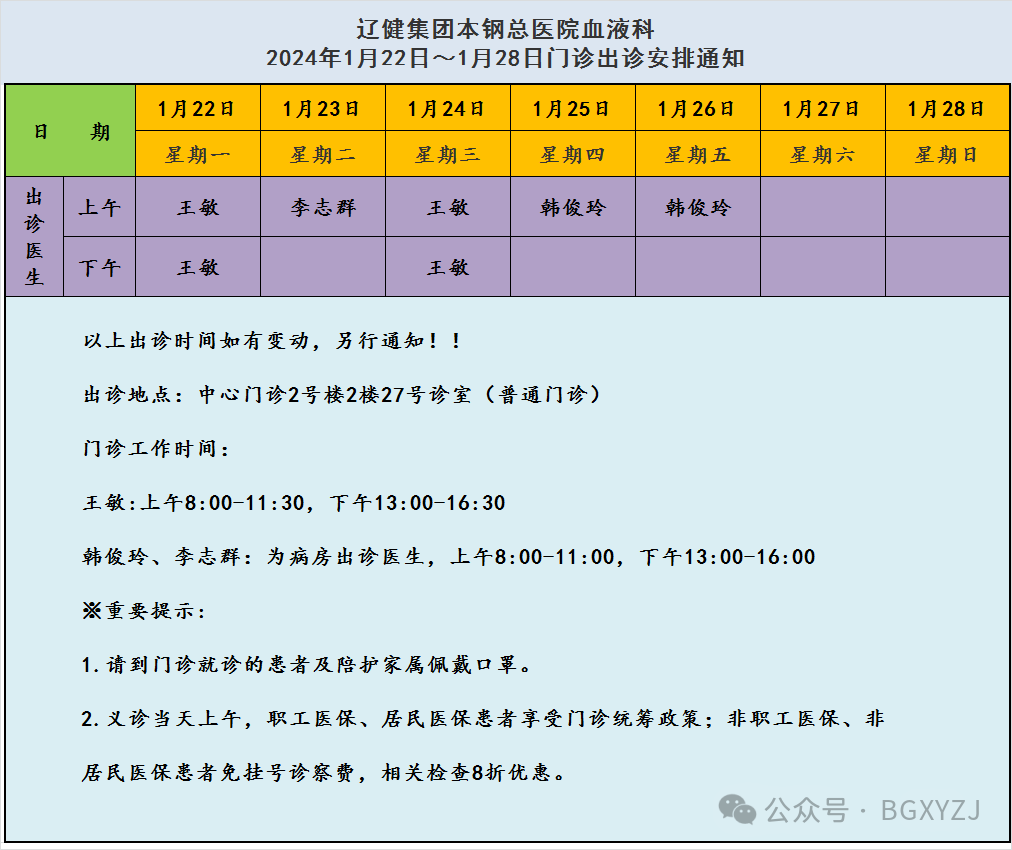 "辽健集团本钢总医院血液科2024年1月22日~1月28日门诊出诊安排通知"