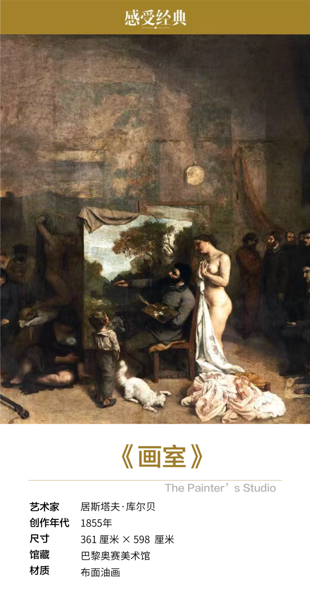 不同于以往的现实主义绘画,《画室》是作者最成功、最耐人寻味的作品,高度概括了画家对1848年以后的生活回忆和艺术观,画家独立的人格、思想也得到完美体现。