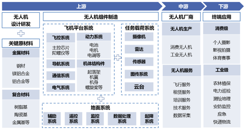 无人机主要分为军用和民用两种类型,其中民用无人机又可分为工业级无人机与消费级无人机,主要用于摄影、灯光表演、巡查等场景。无人机相比有人机优势明显,应用广泛。无人机因其自身的优越性能,可以在超低空和超高空长时间盘旋,活动空间和范围更为广阔。与有人战机相比,军用无人机具有体积小、重量轻、造价低、零伤亡、使用限制少、隐蔽性好、效费比高等突出特点。现代军用无人机的任务范围由传统的空中侦察、战场观察和毁伤评估等扩大到战场抑制、对地攻击、拦截巡航导弹、空中格斗等领域,应用更加广泛。