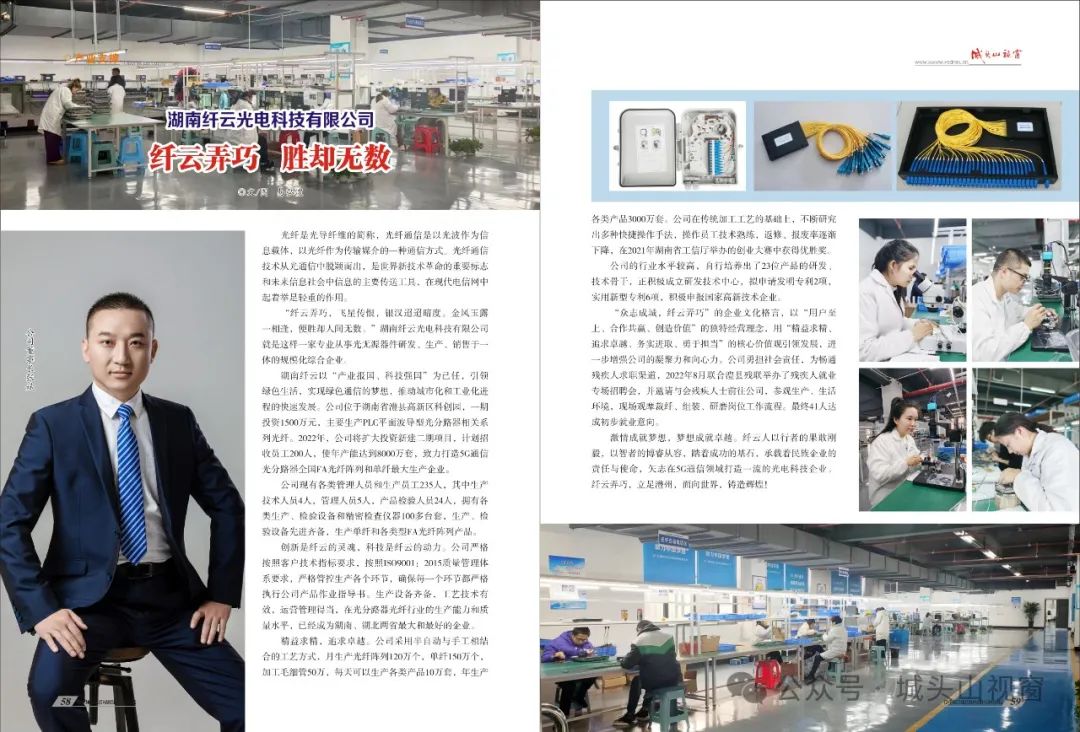 湖南纤云以“产业报国、科技强国”为己任,引领绿色生活,实现绿色通信的梦想,推动城市化和工业化进程的快速发展。公司位于湖南省澧县高新区科创园,一期投资1500万元,主要生产PLC平面波导型光分路器相关系列光纤。2022年,公司将扩大投资新建二期项目,计划招收员工200人,使年产能达到8000万套,致力打造5G通信光分路器全国FA光纤阵列和单纤最大生产企业。