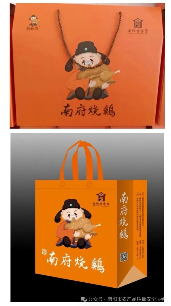 南府烧鸡起源于明朝时的铁面御史南仝府上的一道大菜,距今已有五百多年的家族传承。南氏第十五世南现典光绪十五时在济宁府做染布生意,染布行地处闹市区,就在门口开了一间南家烧鸡店铺,因味道好,南现典为人厚道,南家烧鸡在济宁府成了一道有影响力的名菜。民国十三年南氏第十五世南登杰继承了南家在济宁府的生意;1949 年新中国成立后,实行了公私合营,南登杰携家人回到了山东省郓城县的农村老家。在自己家里开了一间烧鸡作坊,每逢集市就用独轮平板车推到集市上去销售,成为了当地十里八乡的名菜。1978 年改革开放后,南氏 17 世南清柱夫妇又把南家烧鸡在家乡集市上开了门店。南氏第十八代传承人南桂喜、南桂成两兄弟从小在家里烧鸡店里长大,放了学后就帮助父母在烧鸡店里干活,耳濡目染了烧鸡制作的全流程。上世纪九十年代初,南桂喜到郑州烹饪学校去学做厨师,又去河南国际饭店学习厨艺,受到多位名师指导。1996 年南桂喜在国内几大知名烧鸡的基础上,重新塑造了南府烧鸡的新形象,由南家烧鸡更名为南府烧鸡,从山东老家带来了烧鸡的卤汤,在自己开的老陕西饭店里生产销售烧鸡。2019 年委托上海市知名设计公司设计 vI 识别系统以及吉祥物。南府烧鸡的吉祥物是卡通版的设计形象,为人和善厚道的南府老爷子,憨态可掬的手捧着刚刚岀锅的南府烧鸡,让从门前过往的人们品尝。