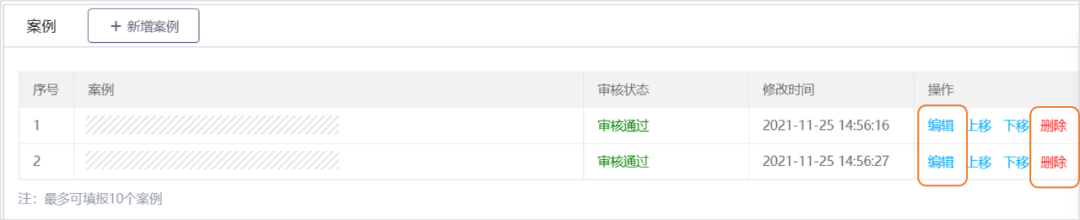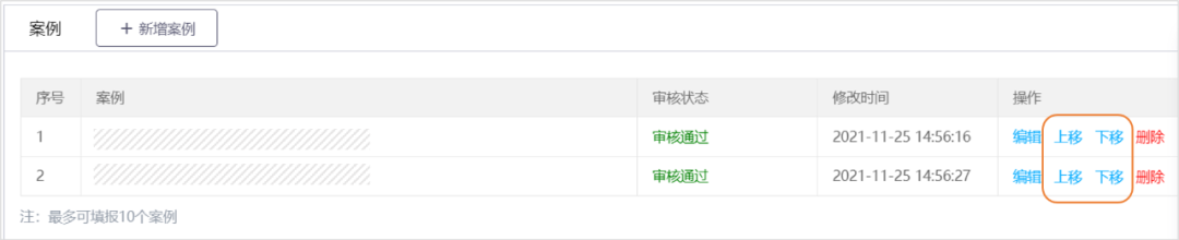 在案例列表页,点击【上移】或【下移】按钮,可调整案例顺序,该顺序和线上展案例列表展示顺序一致。