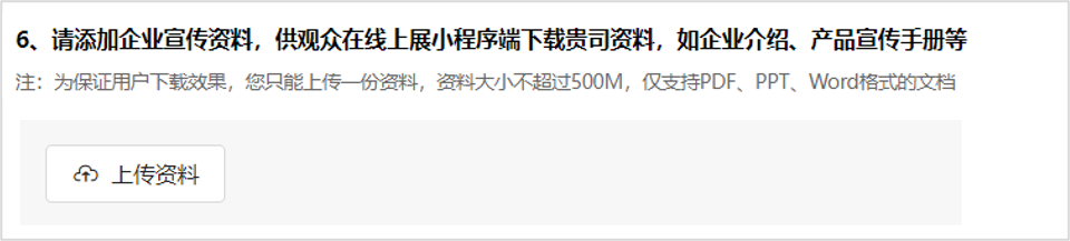 每家企业可上传一份企业宣传资料,给到观众下载,为保证观众下载效果,资料大小不超过500M,仅支持pdf\ppt\word格式的文档。
