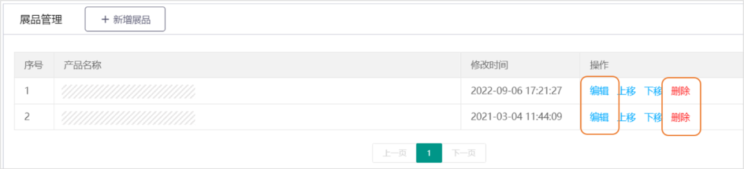 在展品列表页,点击【上移】或【下移】按钮,可调整展品在线上展展示的先后顺序。
