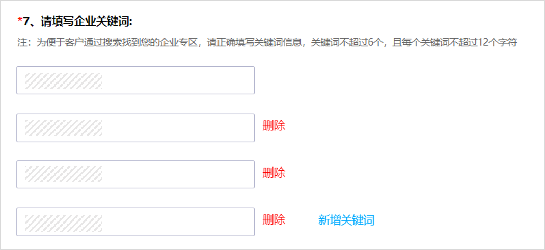 为便于观众搜索到您的企业,请准确填报企业关键词,关键词不超过6个,每个词条不超过6个汉字。