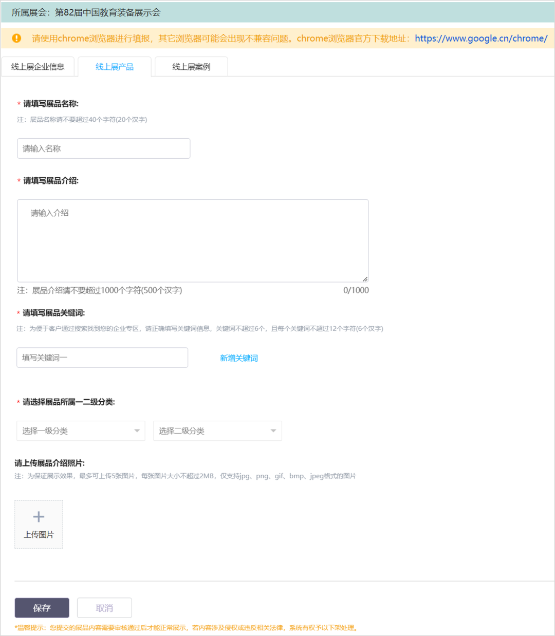 点击【新增展品】,进入添加展品信息。注意:新增的产品只在“线上展”展示,不收录到《第83届中国教育装备展示会参展产品名录》。