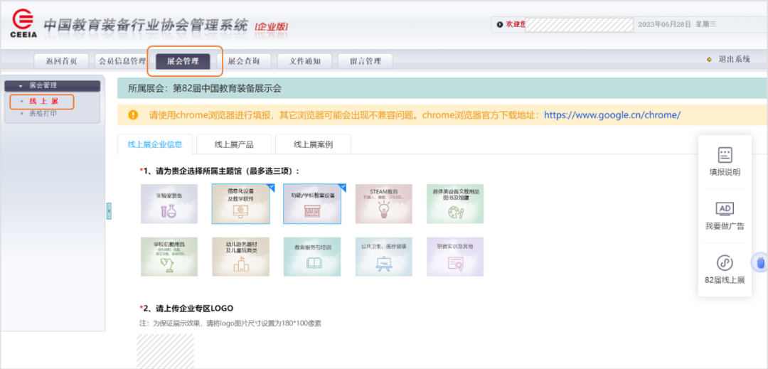 登录“中国教育装备行业协会管理系统”(zh.ceiea.com,即报展系统),进入【展会管理】栏目,点击左侧功能菜单【线上展】,按顺序进行信息填报。