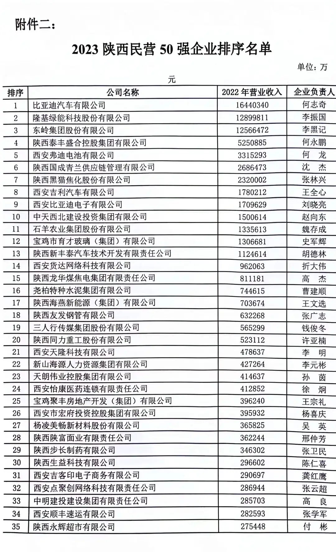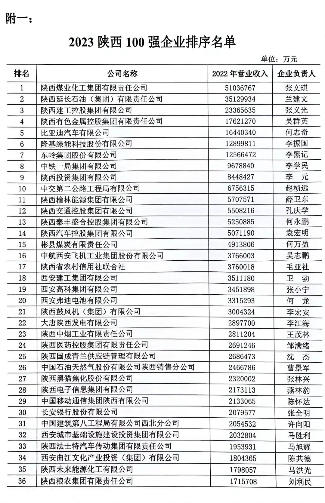 陕西省企业家协会1月20日发布2023陕西100强企业和陕西民营50强企业榜单,陕煤集团,延长石油,陕西建工集团位列百强榜前三名。比亚迪汽车,隆基绿能,东岭集团则占据民营企业50强名单前三甲。