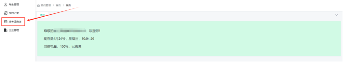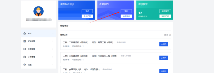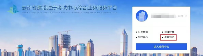 企业登录企业账号之后可以直接点击右上角的“考务预约”,也可以点击进入业务中心,进去之后点击“考务预约”