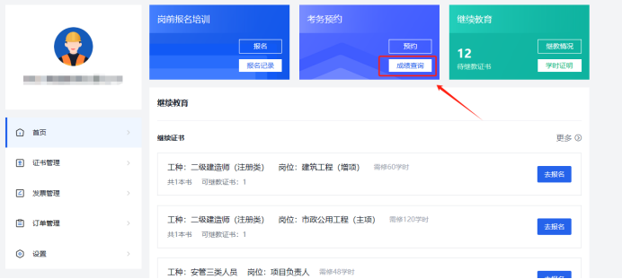 2.登录企业账号→进入业务→考务预约→成绩查询