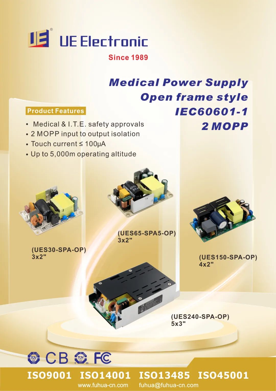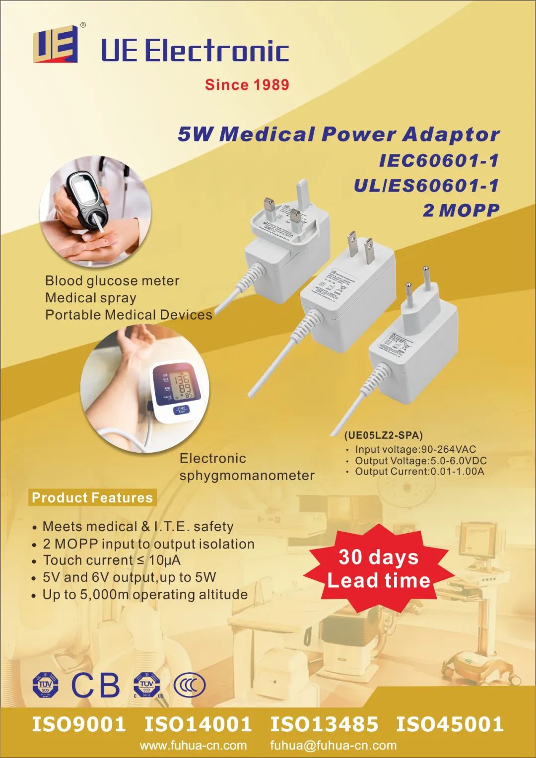 此次展会,UE Electronic将给大家带来最新研发的医疗电源全系列。功率涵盖5~240W,符合六级能效,2MOPP标准,认证齐全,插墙式/桌面式可选,广泛应用于各类医疗器械设备。