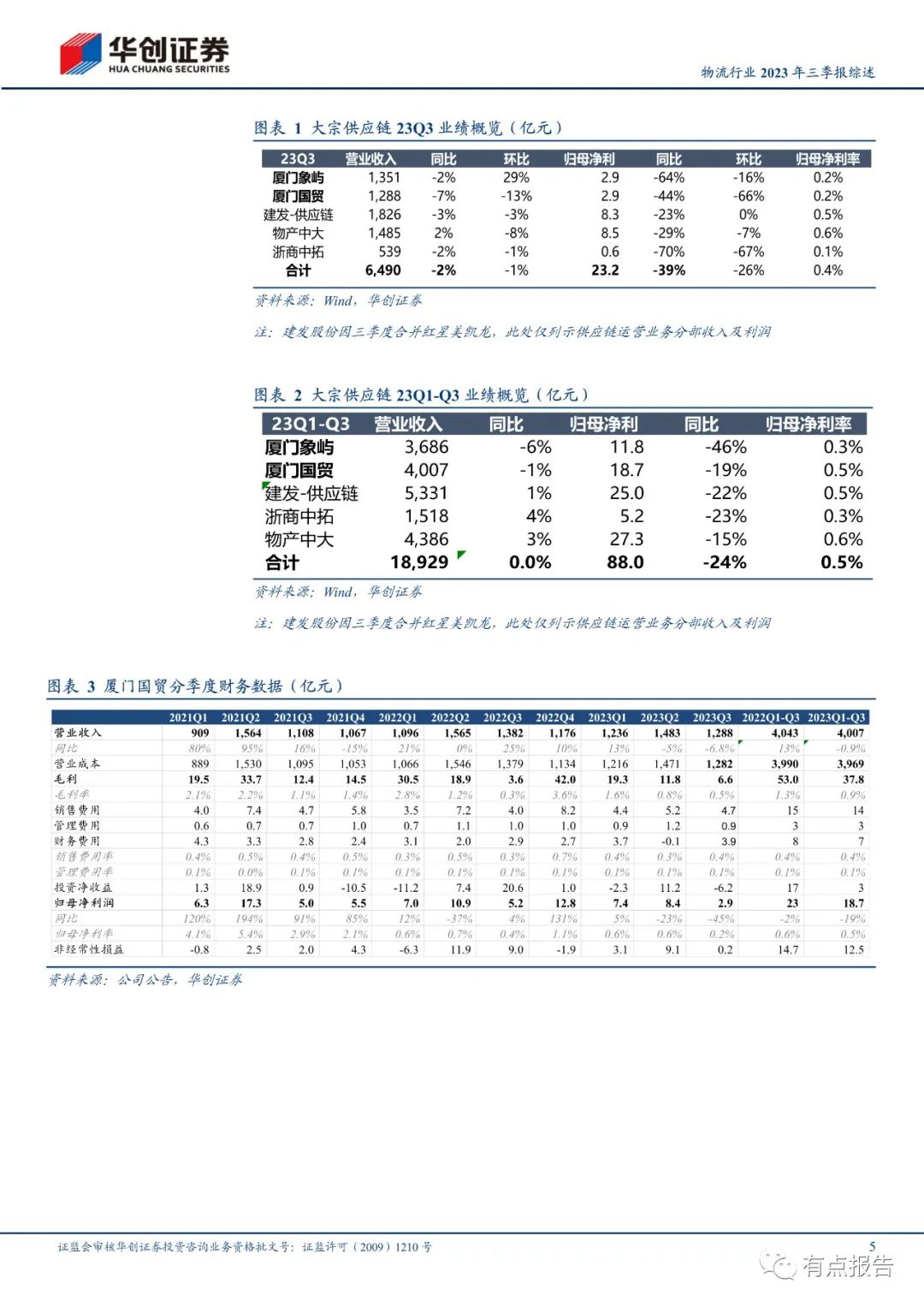 重因素影响,归母净利大幅下滑。23Q3 五家核心公司实现归母净利 23.2 亿元,同比下滑 39%,环比下滑 26%。其中象屿、国贸 Q3 归母净利均为约 2.9 亿,同比分别下降 64%与 44%。