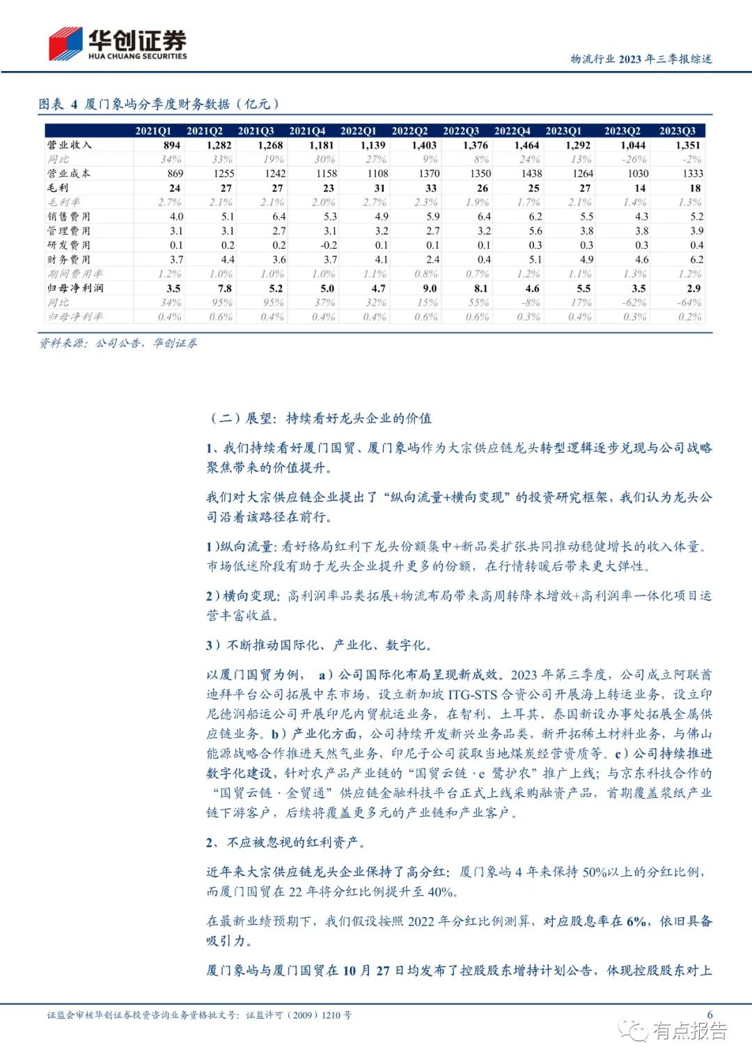 我们分析:今年二季度与三季度,大宗商品市场表现较为极端,过去稳健经营的大宗供应链公司在通过强弱周期品类组合对冲、以及执行期现结合套期保值工具运用中,遇到了一定压力。同时,在实体经济仍在恢复的阶段中,龙头公司亦选择给予客户支持。展望:我们持续看好厦门国贸、厦门象屿作为大宗供应链龙头转型逻辑逐步兑现将推升价值回归。
