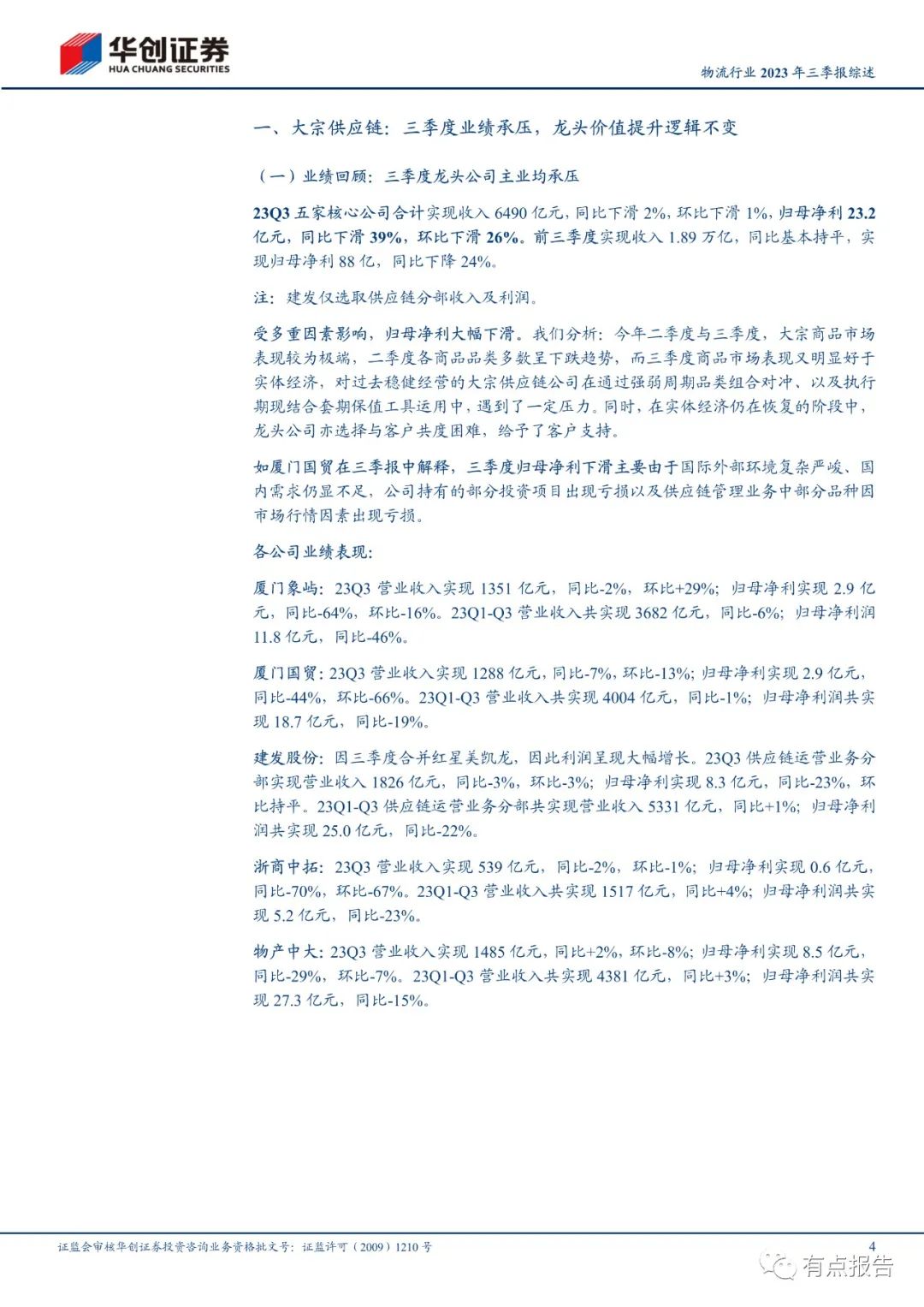 大宗供应链:三季度业绩承压,龙头价值提升逻辑不变。业绩回顾:受多