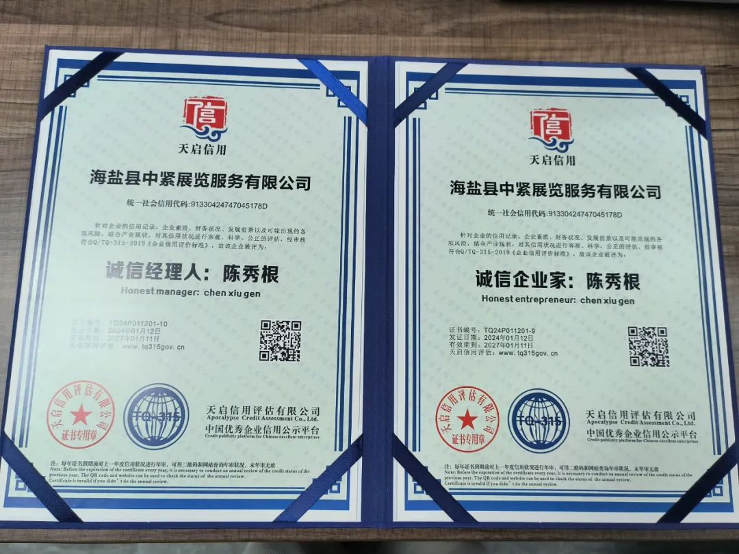 近日,经相关部门评审,嘉兴紧博会执行承办单位之一海盐县中紧展览服务有限公司荣获“AAA级重质量守信用企业”“AAA级重服务守信用企业”“AAA级重合同守信用企业”“AAA级质量服务诚信单位”“AAA级资信企业”“AAA级信用企业”“TQ-315质量服务客户诚信企业”“AAA级诚信供应商”“TQ-315诚信企业”“AAA级质量服务信誉企业”“AAA级诚信经营示范单位”等多项称号!同时,中紧传媒董事长陈冠达获“诚信经理人”“诚信企业家”称号!