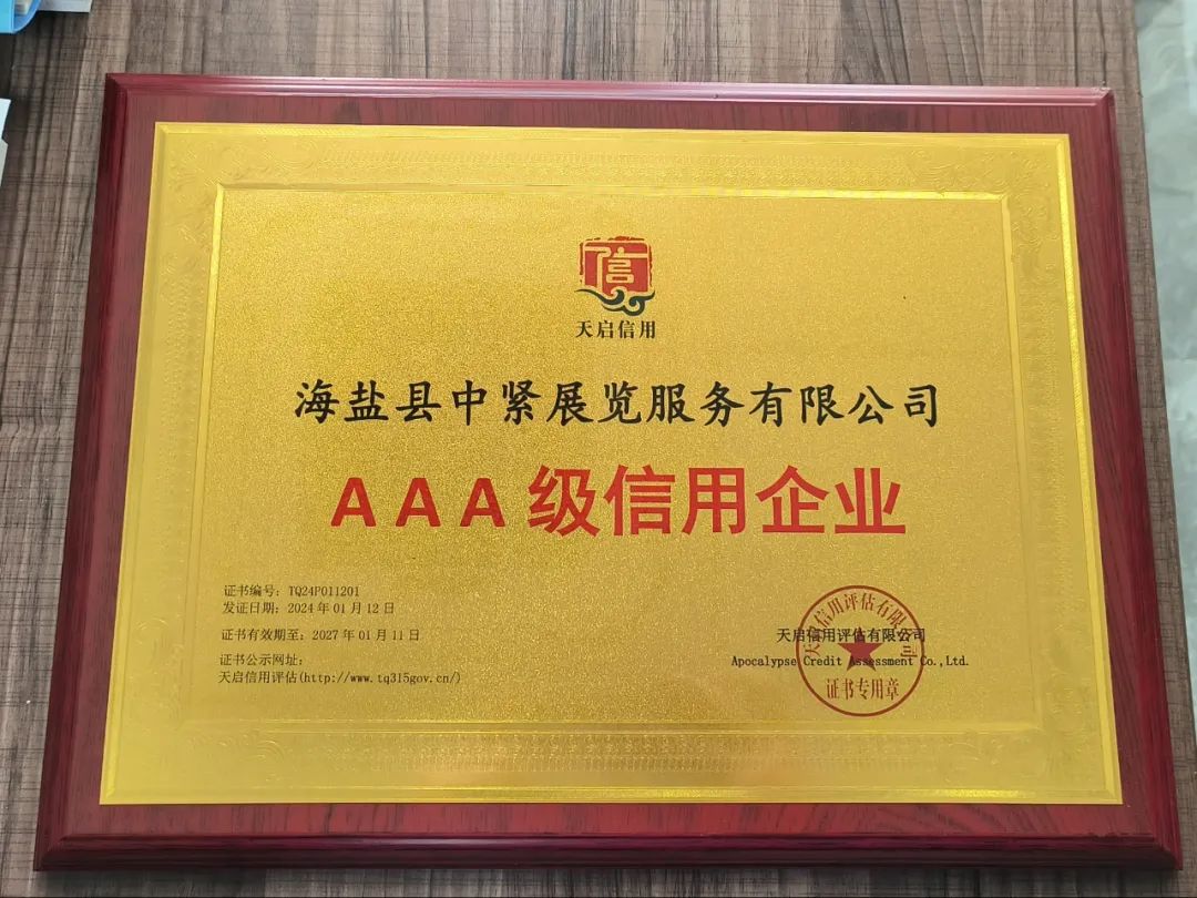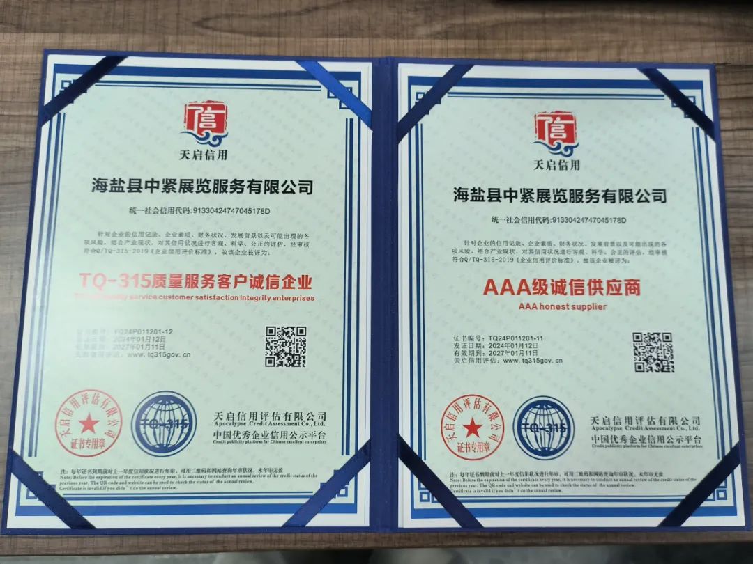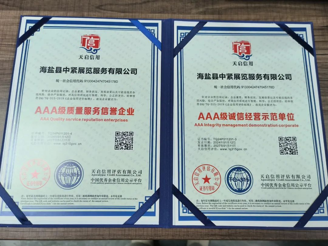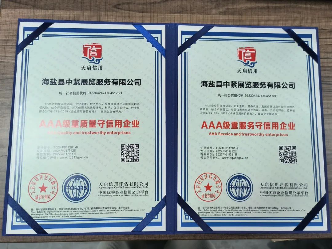 喜报!嘉兴紧博会执行承办单位之一——海盐中紧展览公司荣获“AAA级资信企业”“AAA级重质量守信用企业”等称号