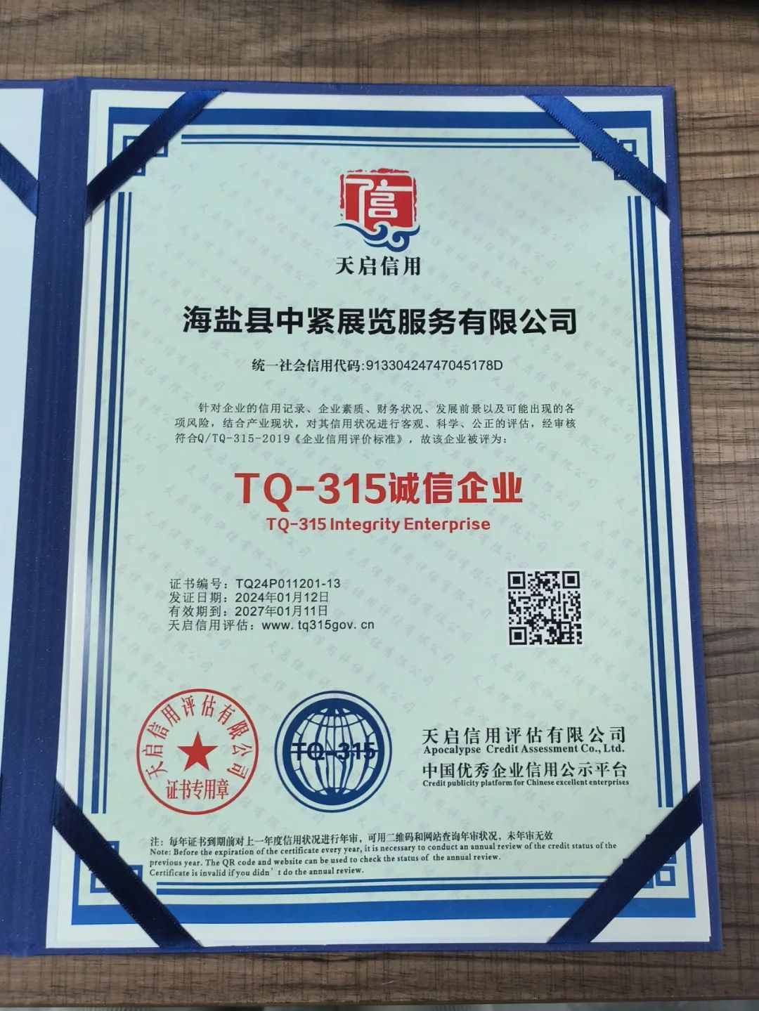 企业信用等级是企业发展过程中信用形象的重要标志,本次海盐县中紧展览服务有限公司荣获多项称号,充分体现了评审机构和社会各界对海盐中紧展览公司在依法经营、规范管理、服务品牌、社会责任等方面的高度认可与充分肯定。