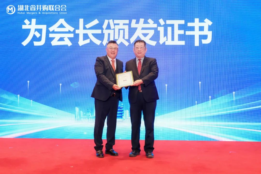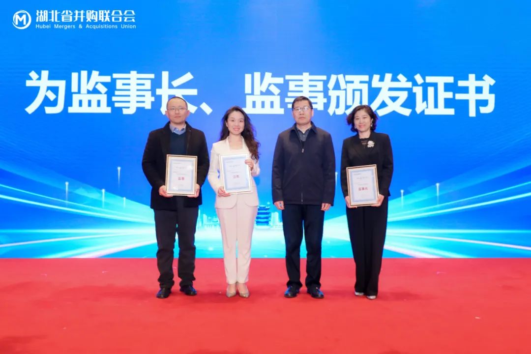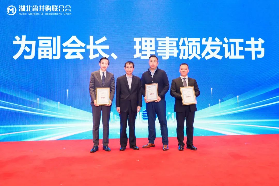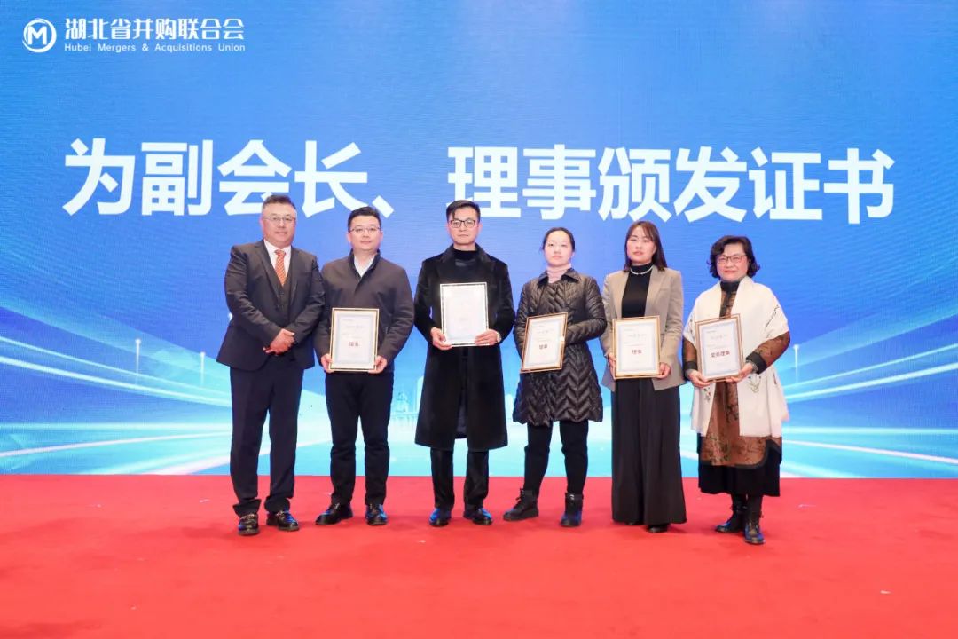 湖北省工商联副主席彭斌为湖北省并购联合会监事长刘兵、监事徐东、俞素梅颁发证书。