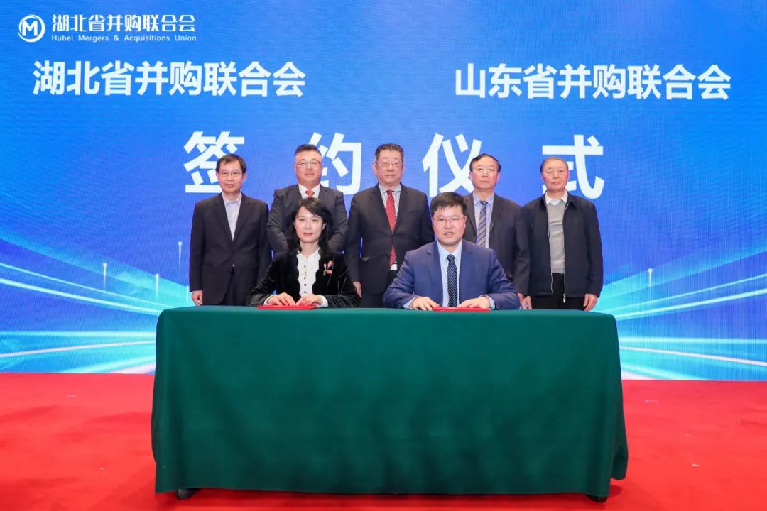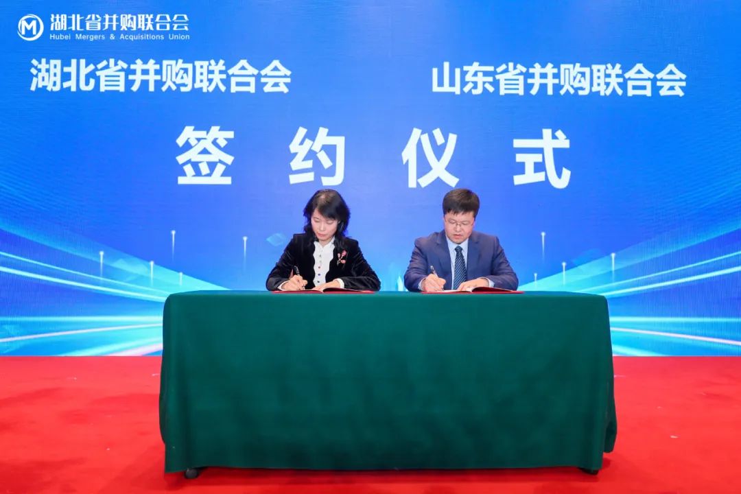 在全联并购公会顾问刘红路、全联并购公会秘书长沈联合、湖北省并购联合会荣誉会长孙文、湖北省并购联合会荣誉会长戴伟、湖北省并购联合会荣誉会长周茂清、湖北省并购联合会会长吴立新的见证下,湖北省并购联合会秘书长王平和山东省并购联合会秘书长蔡芳女士,分别代表湖北并购联合会与山东省并购联合会,共同签署战略合作协议。