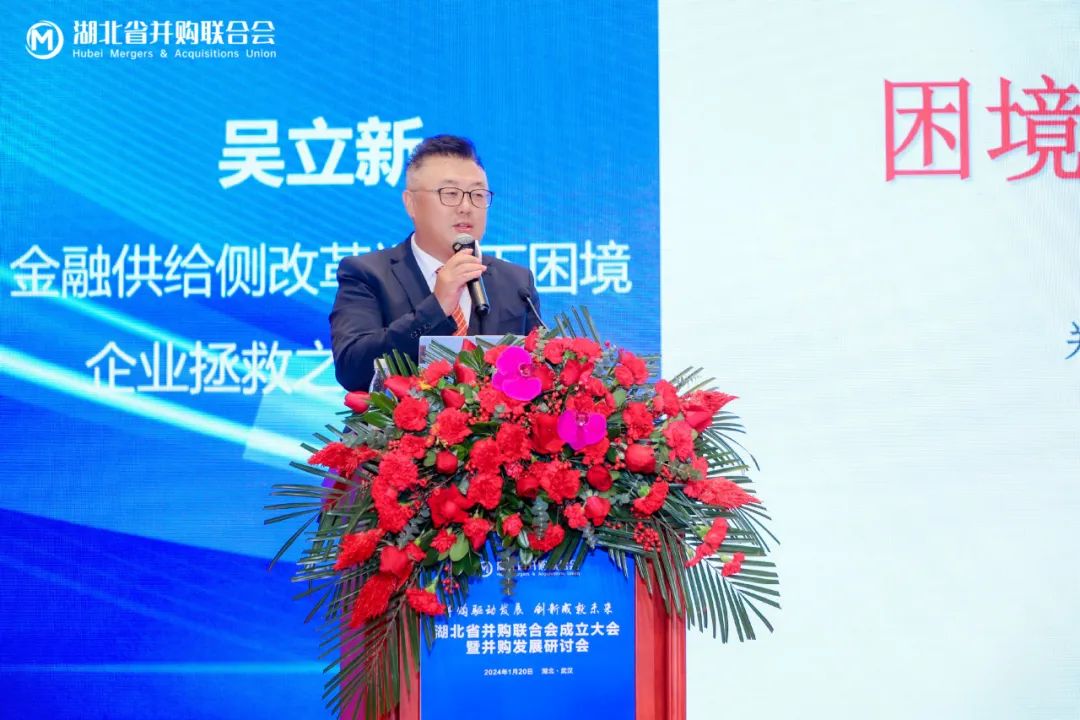吴立新会长发表致辞。他对各位领导在湖北省并购联合会筹备过程中的重视和指导、会员单位和同仁们的大力支持表达了真诚的感谢。他将肩负重任,努力推动湖北经济高质量发展。吴立新还强调联合会将以并购赋能湖北经济为准则,助力产业龙头企业做强做大,同时帮扶困难企业,防范债务风险,为维护资产安全和社会稳定做出贡献。他承诺将与全体会员一道,为推动并购市场健康永续发展提供优质服务和专业支持。联合会将联合各方共建共享、共生共融。此外吴立新会长还呼吁大家以赤子之心、专业之精神、并购之伟力,共同推动并购市场的健康发展,为区域经济高质量发展贡献力量!