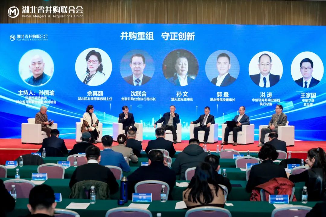 圆桌论坛“并购重组,守正创新”由深圳市政协委员、湖北省并购联合会首席战略官、网眼控股董事长孙国瑜主持,楚天激光董事长孙文,全联并购公会执行秘书长沈联合,湖北民本律所创始人、主任余其颐,湖北楚民投控股有限公司董事长郭登,中信证券并购业务线执行总监洪涛,中韬华益税务师事务公司总经理王家国受邀参加,共同研讨企业并购与投融资的最新趋势,分享成功经验。