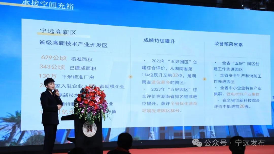 第二阶段招商推介大会由副县长杨国基主持。县政协副主席、工商联主席、总商会会长肖红梅在招商推介中表示,宁远正在驶入高质量发展的快车道,呈现出蓬勃生机与巨大潜力。宁远高新区产业集聚效应明显,营商环境一流,发展潜力巨大,真诚期盼大家回乡投资兴业,并通过商会这个平台多为家乡宣传发声,贡献力量。