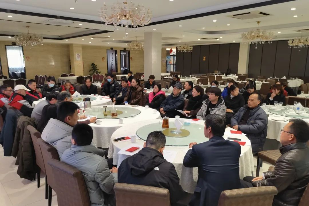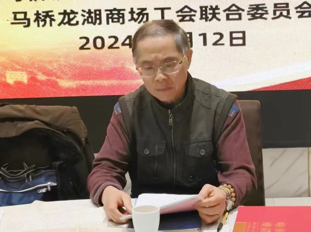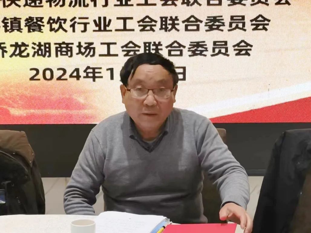 马桥镇餐饮行业工会联合委员会主席胡登宝主持会议,快递物流行业工会联合委员会主席刘金城作2023年度行业工会工作总结报告。