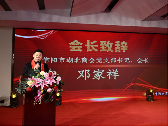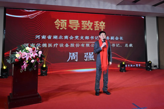 河南省湖北商会党支部书记、常务副会长,河南优德医疗设备股份有限公司党委书记、总裁周强在致辞中,充分肯定了信阳市湖北商会取得的成绩,他表示信阳市湖北商会在新一届会长邓家祥的带领下,秉承办会宗旨,着力弘扬楚商精神,加强自身建设,通过广泛开展活动,搭建交流平台,加强合作共赢扩大商会影响力,注重宣传树立新时代新楚商的新形象,勇担社会责任助力家乡发展,为豫、鄂两地经济社会发展作出了积极贡献,取得了丰硕成果,他代表省湖北商会会长许锐及班子成员表示热烈祝贺!