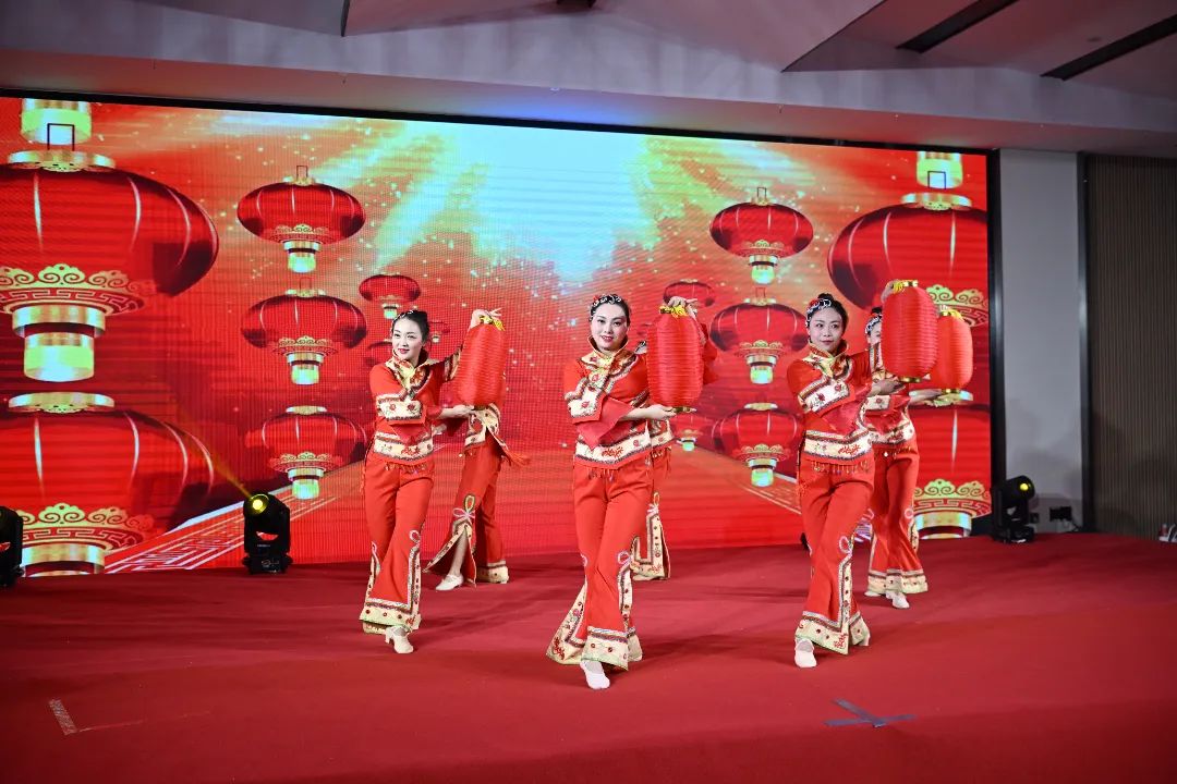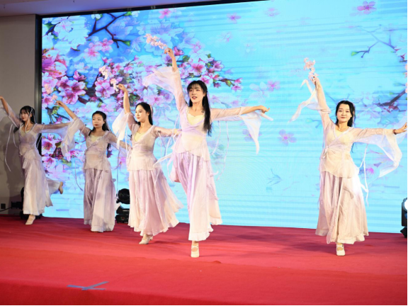 年会在精彩的开场舞蹈《春三月》中拉开帷幕,舞者们身着粉红衣服,欢快的鼓声和舞姿为现场营造出欢乐祥和的气氛,抒发和表达了春天到来万物复苏、充满生机景象。