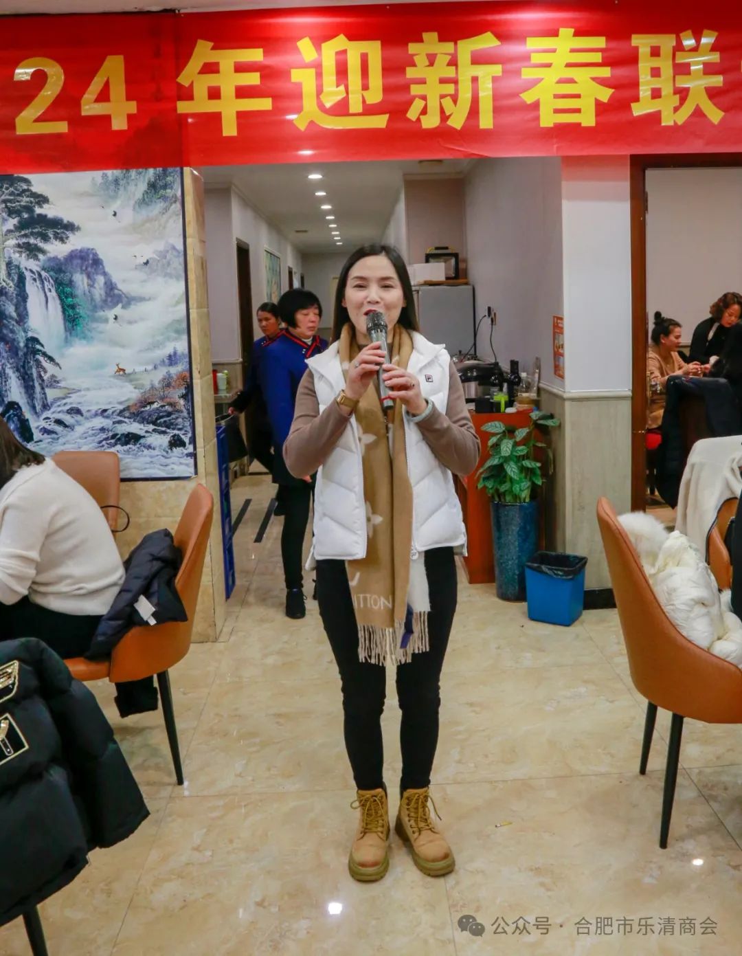 联谊会由商会妇女联合会会长黄美燕主持,她对各位领导、各位来宾、各位老乡的到来表示热烈的欢迎,并代表商会妇女联合会全体姐妹祝迎新春联谊会庆典取得圆满成功!回顾2023年在合肥市乐清商会的正确领导下,我们妇联搭建了沟通和交流的平台,创造了姐妹们在舞台上的魅力所在!带给我们人生中许多美好的回忆!展望2024我们要不断的提升自我,让自己更加有内涵!最后祝我们的商会越来越强大,更加团结友爱!祝在座的每一位领导、来宾、老乡事业蒸蒸日上!合家幸福安康!龙年吉祥!