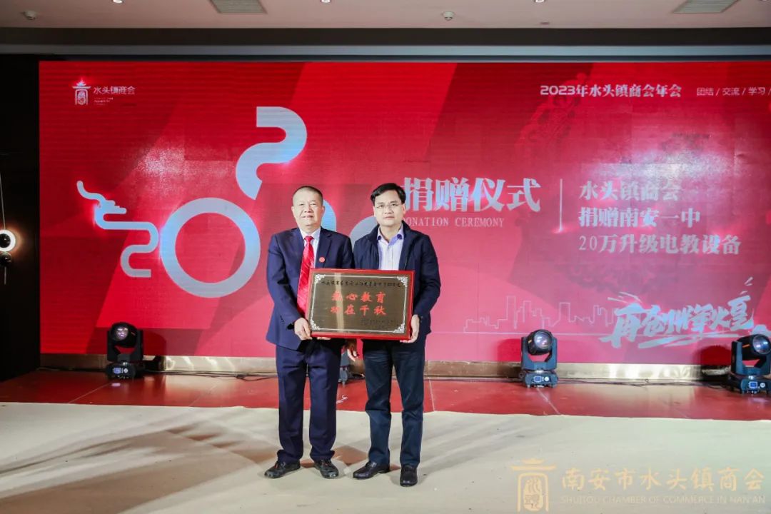 会上,市委统战部副部长、市工商联党组书记、常务副主席黄保林为南安市水头商会颁授“热心教育 功在千秋”的牌匾,对商会热心南安一中电教中心的捐赠行为表示感谢。