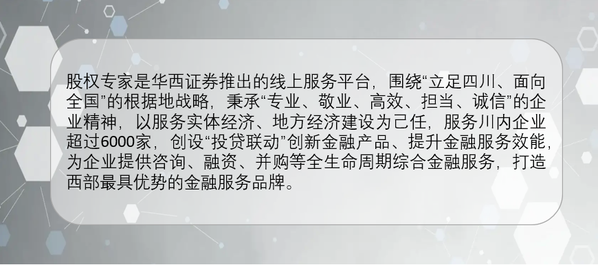 华西证券战略客户中心上市公司部依托战略客户服务体系,打造上市公司研究中心,以提升上市公司质量为导向,为上市公司发展的各个阶段提供全方位、一站式的综合金融服务,为上市公司股东提供一揽子的资产配置类服务,构建围绕上市公司高质量发展的产业生态圈。
